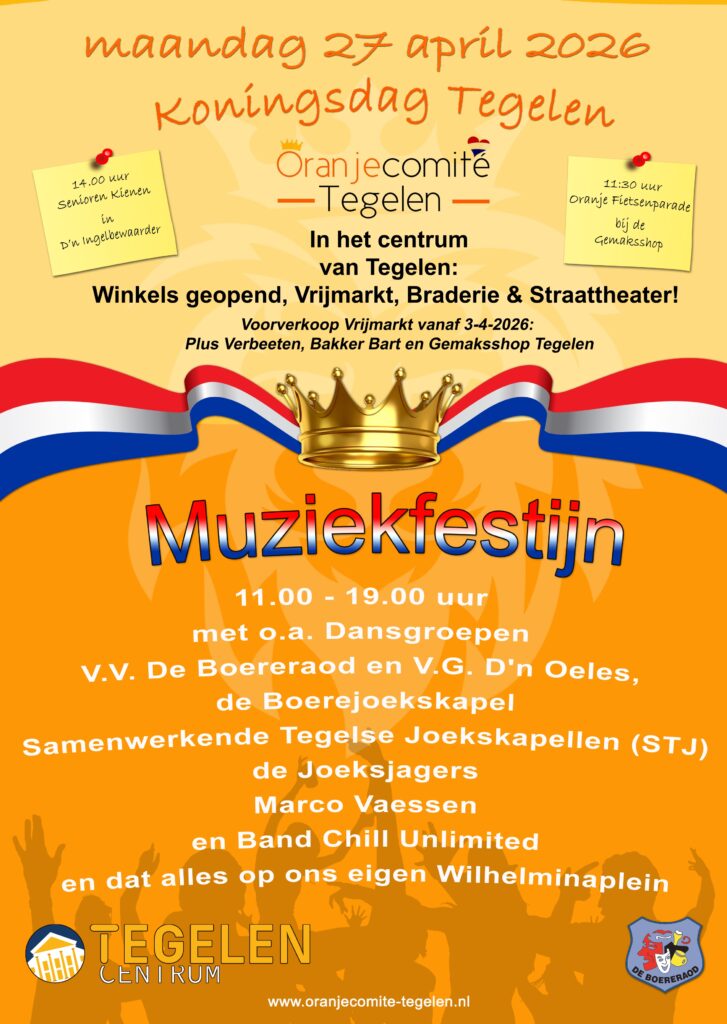 🎊Kom verder genieten van optredens van Dansgroepen V.V. De Boereraod en VG de Oeles en de diverse optredens van de Samenwerkende Tegelse Joekskapellen, de Joeksjagers, Marco Vaessen en de band Chill Unlimited! Dit geweldige evenement wordt georganiseerd door De Boereraod en Oranjecomité Tegelen! 🎼💙🧡💙